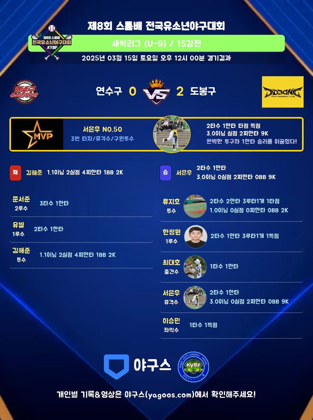 | 1 | 서은우(50) | 승 | 3.0 | 16 | 11 | 2 | - | 5 | 9 | 75 | - | - | 0.00 |