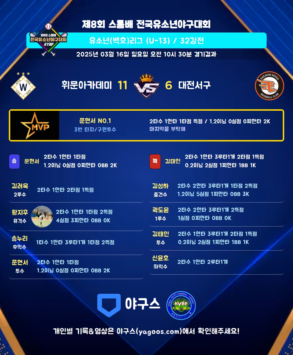 | 3 | 투 | 문현서(1) | 우안(1타점) | 4구 | 삼진 | 2 | 1 | 1 | - | - | 3 | 1 | 1 | 0.500 |