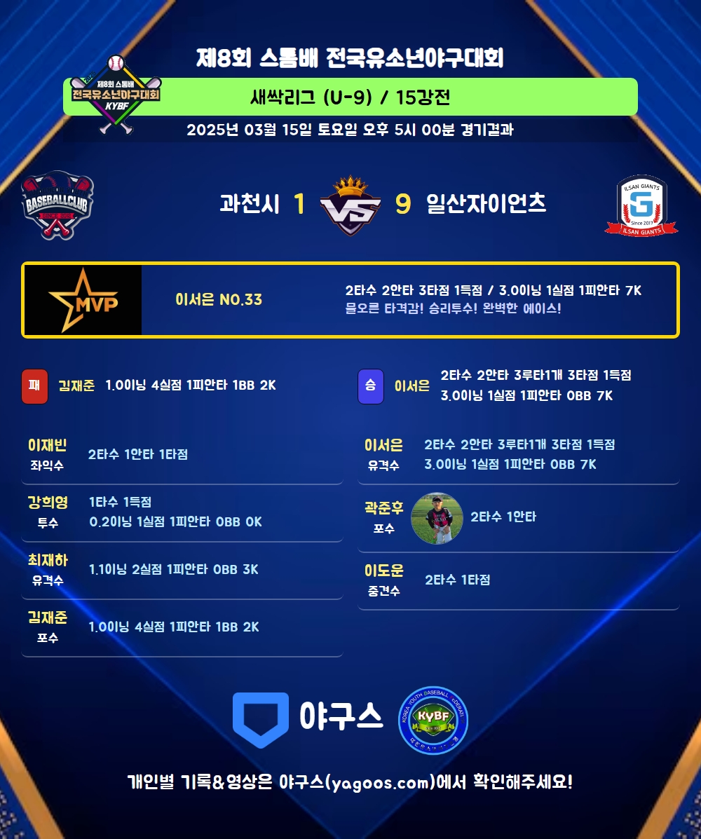 | 일산자이언츠 | 0 | 6 | 3 | 9 | 3 | 0 | 10 | 2 |