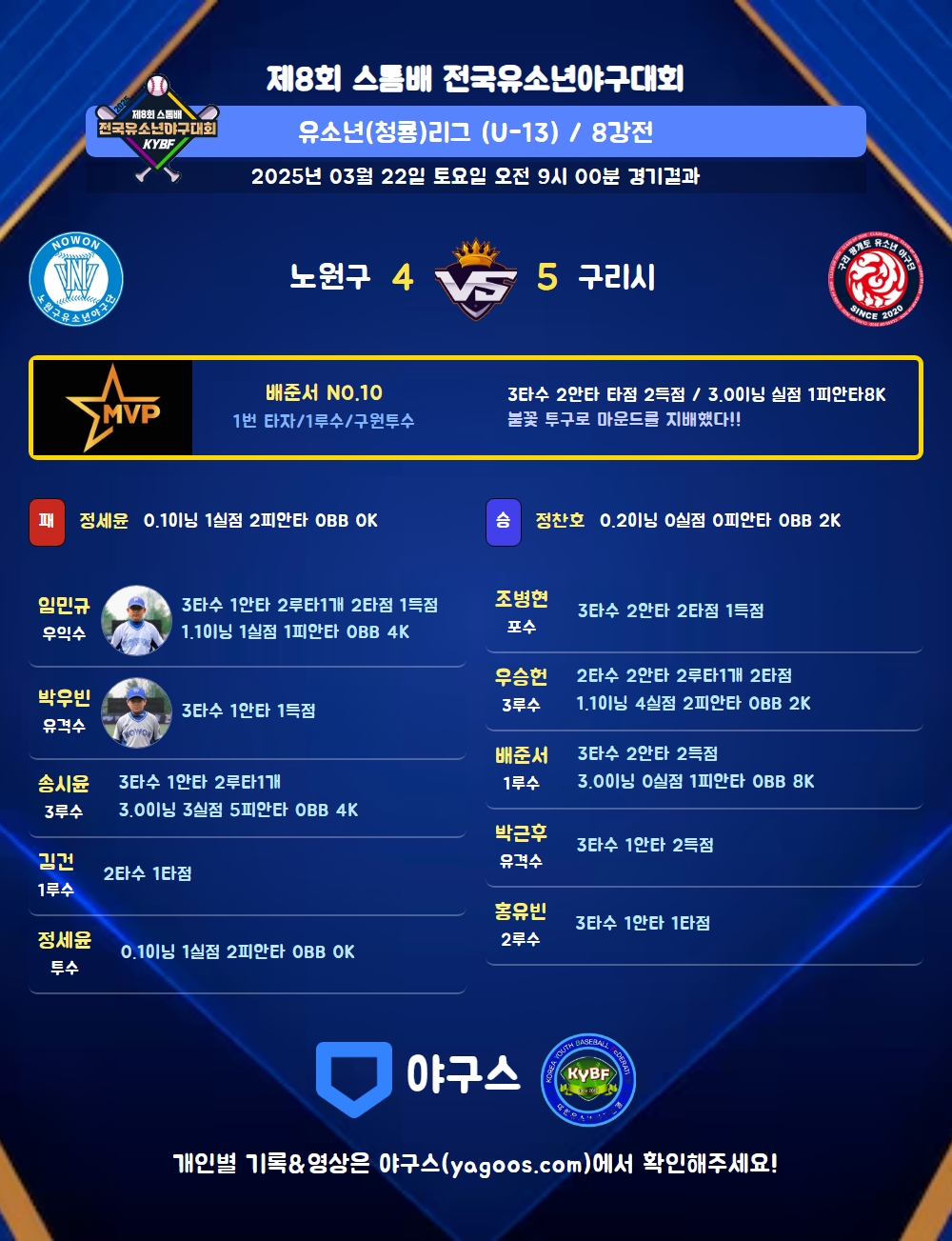 | 4 | 정찬호(19) | 승 | 0.2 | 2 | 2 | - | - | - | 2 | 10 | - | - | 0.00 |