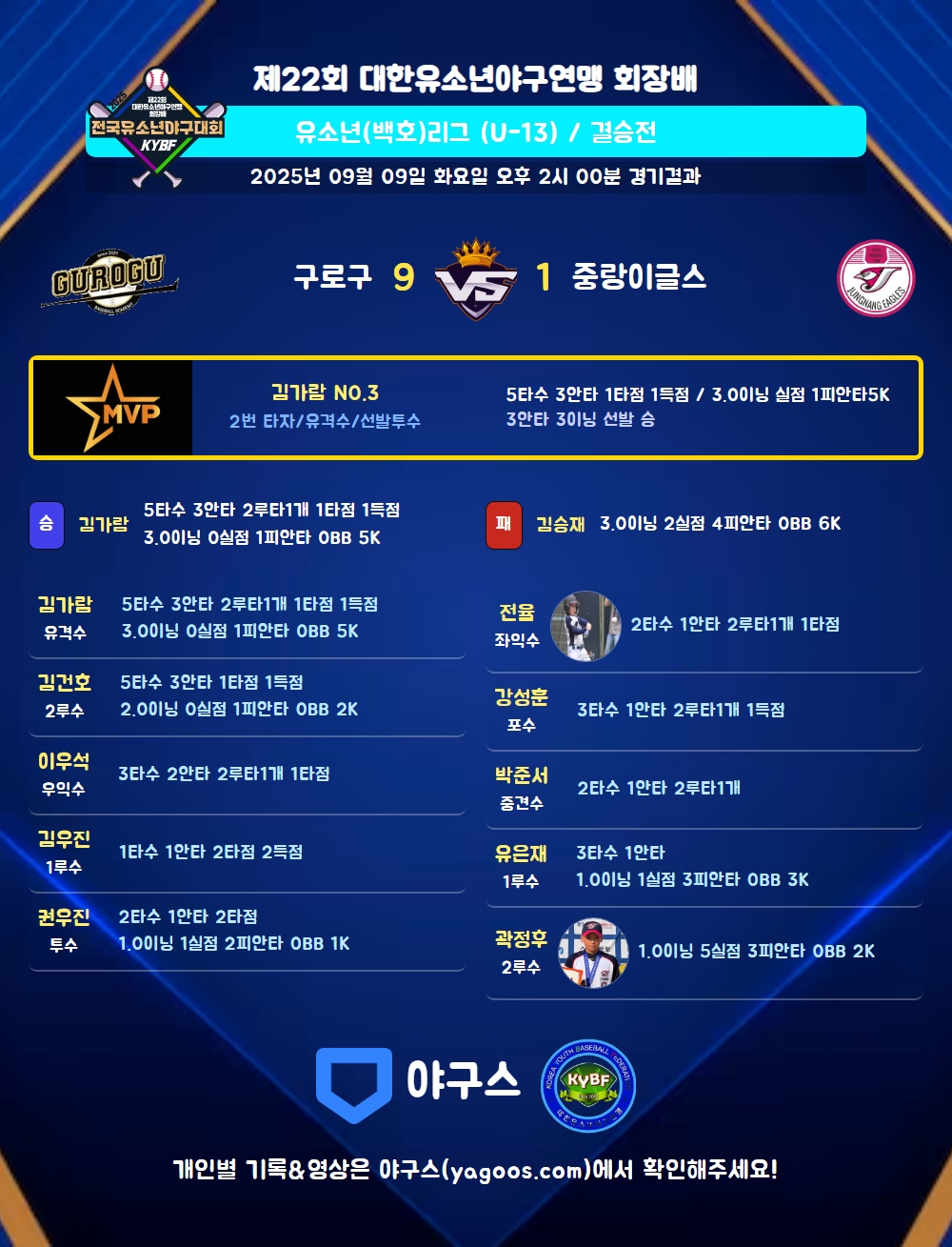 | 9 | 一 | 김우진(51) | - | 4구 | - | 4구 | 중안(2타점) | 4구 | - | 1 | 1 | 2 | 2 | - | 1 | 3 | - | 1.000 |