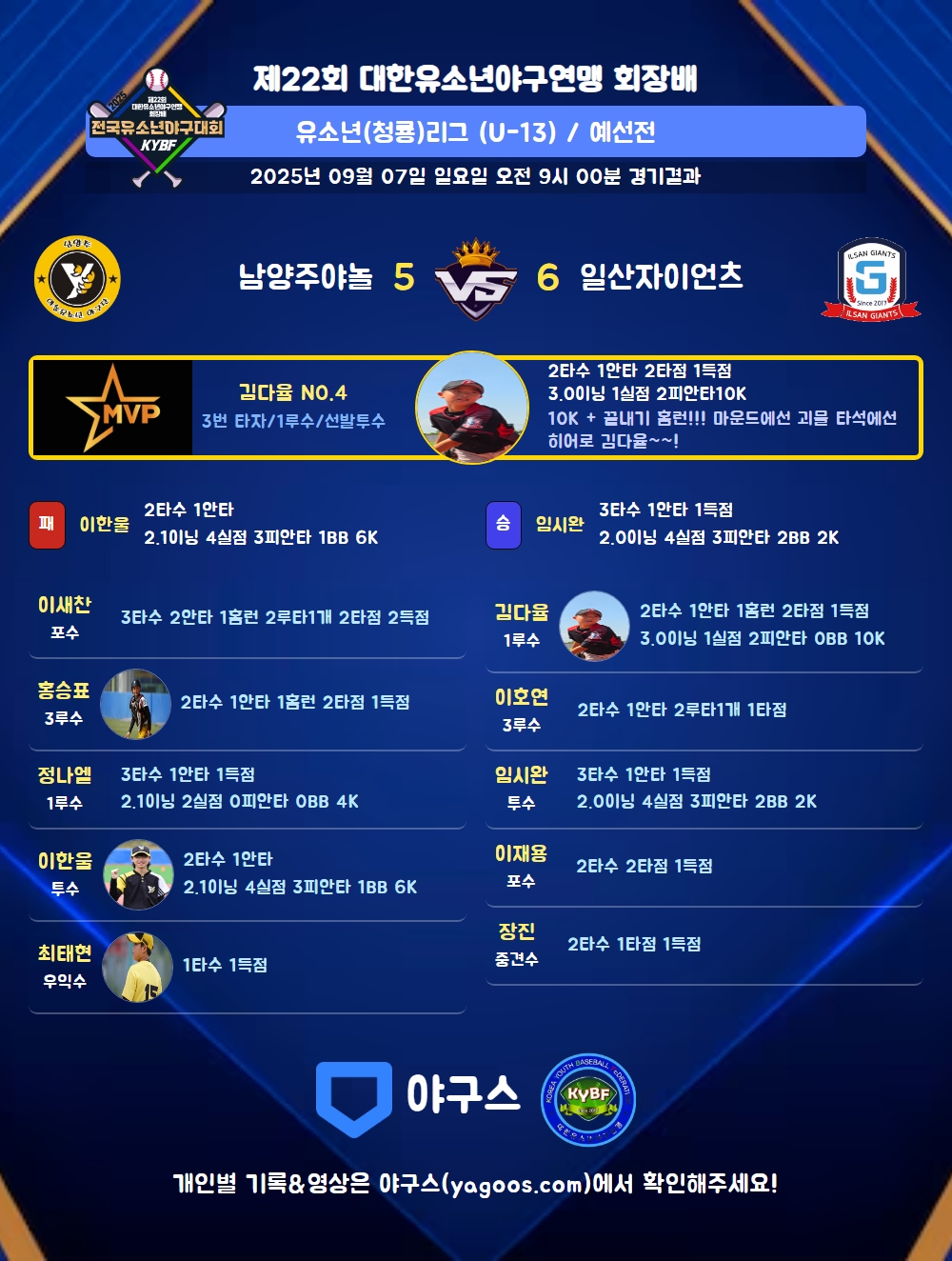 | 일산자이언츠 | 0 | 0 | 5 | 0 | 1 | 6 | 3 | 1 | 4 | 1 |