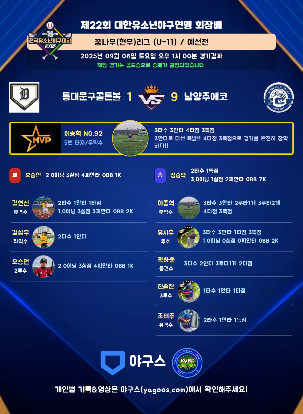 | 9 | 좌 | 곽민준(62) | - | 4구 | 삼진 | - | 1 | 0 | - | - | - | 1 | 1 | 1 | 0.000 |