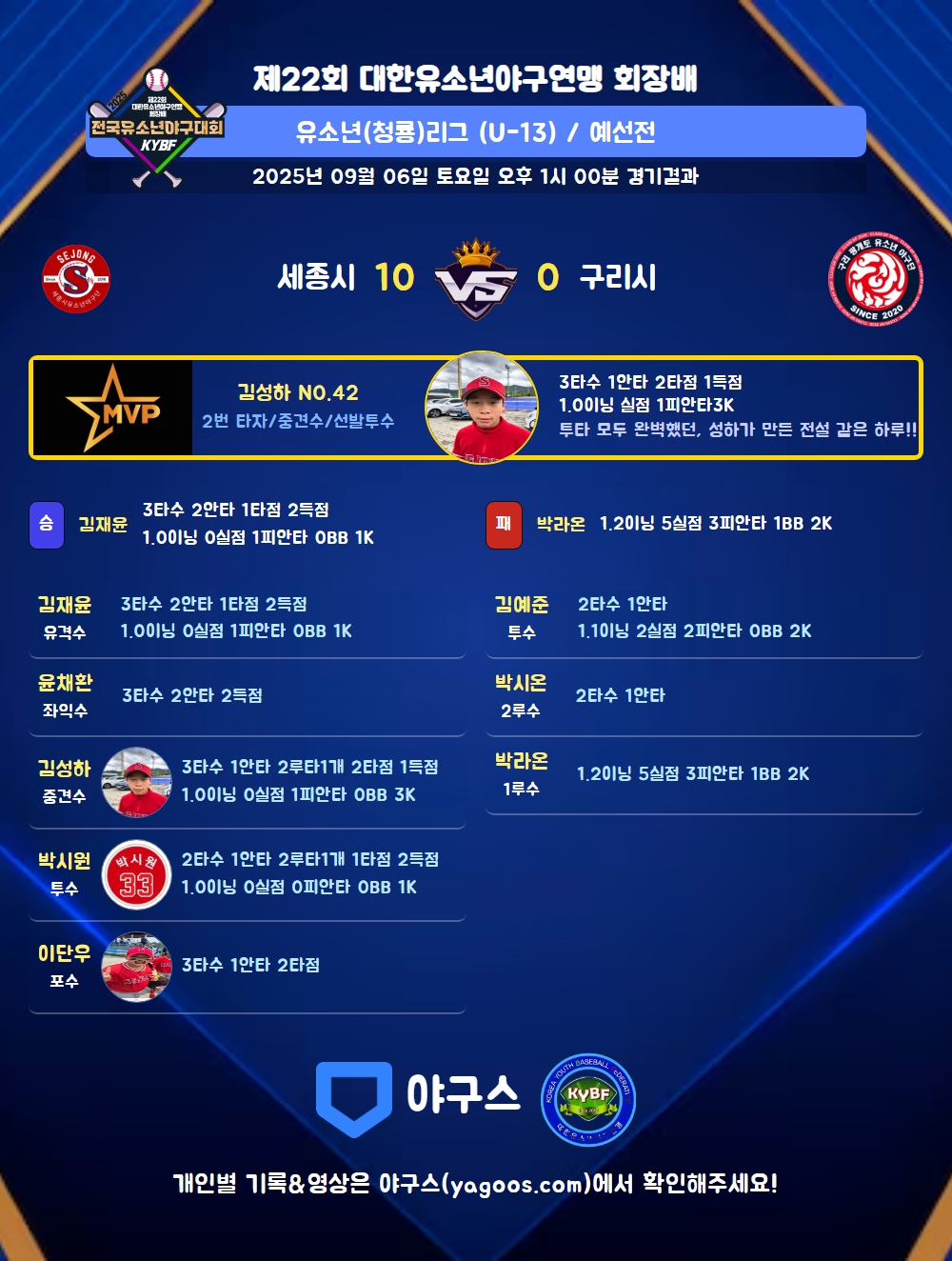 | 3 | 二 | 선정우(18) | 1땅 | 유실 | 중안(1타점) | 3파플 | - | 4 | 1 | 1 | 2 | - | - | - | - | 0.250 |