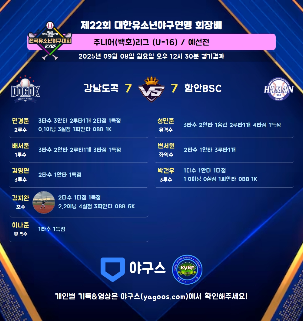 | 함안BSC | 3 | 3 | 1 | 0 | 0 | 7 | 4 | 1 | 8 | 6 |