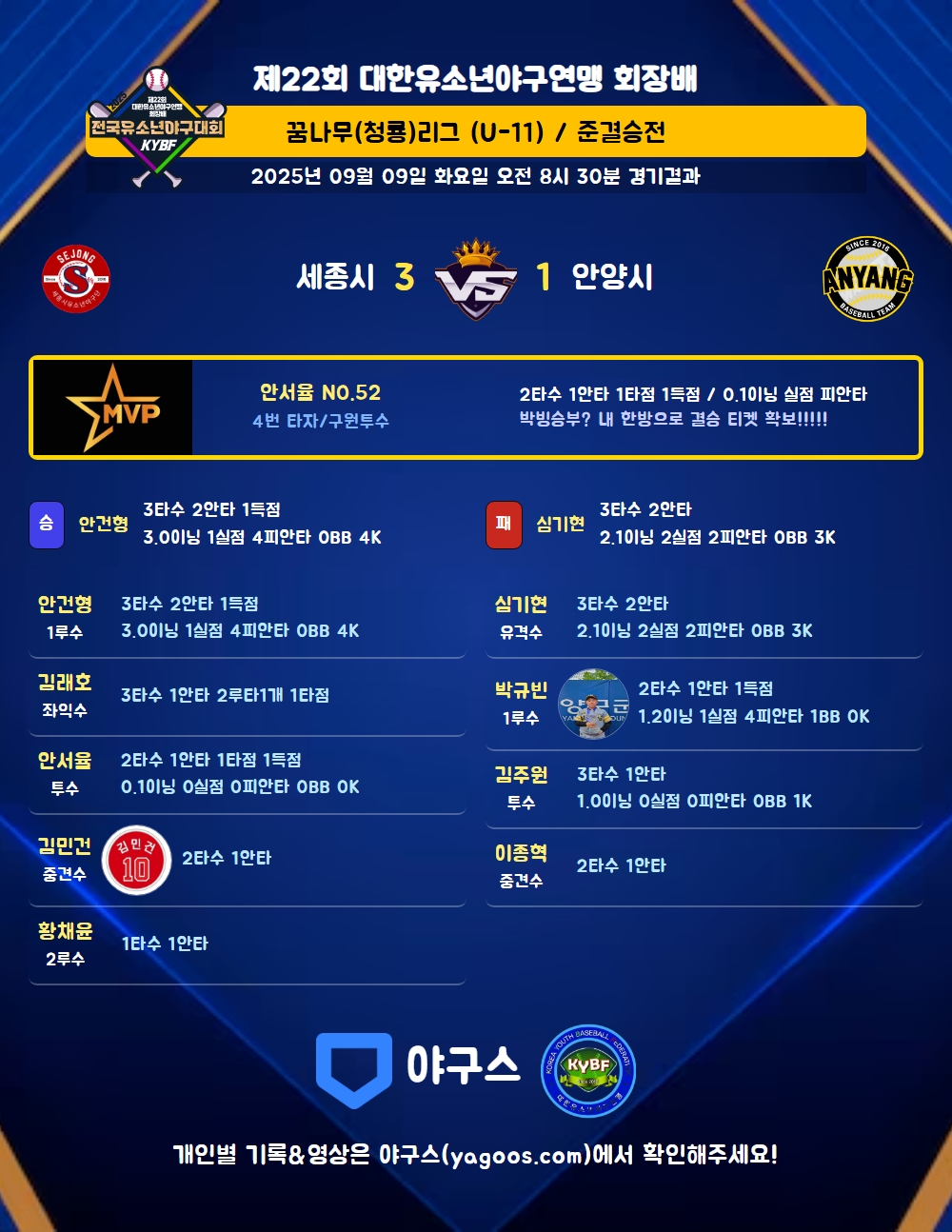 | 9 | 중 | 이종혁(52) | - | 유내안 | - | 삼진 | - | - | 2 | 1 | - | - | - | - | - | 1 | 0.500 |