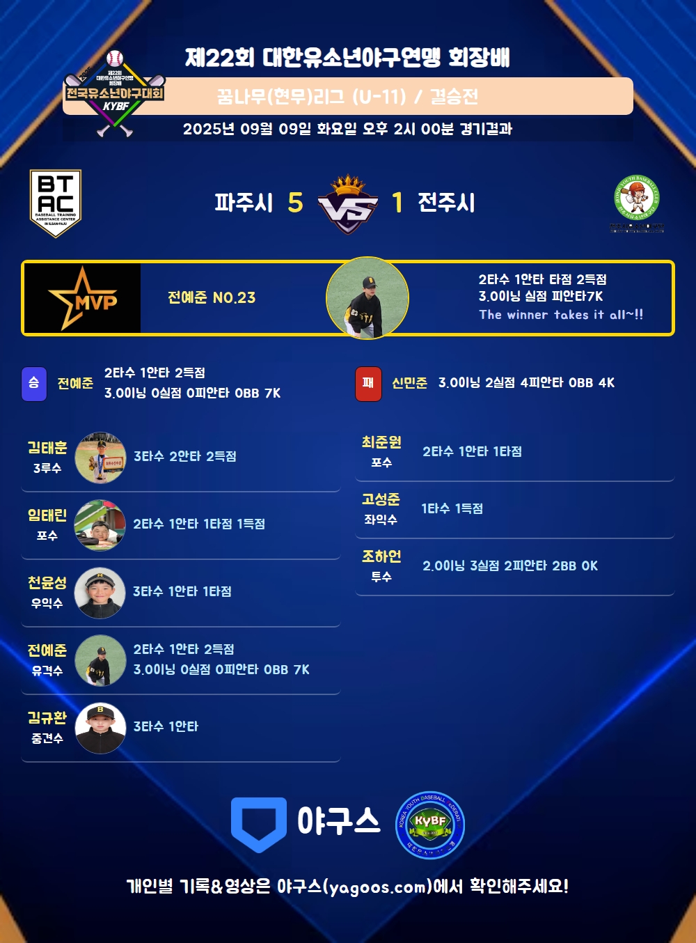 | 1 | 전예준(23) | 승 | 3.0 | 9 | 9 | - | - | - | 7 | 41 | - | - | 0 |
