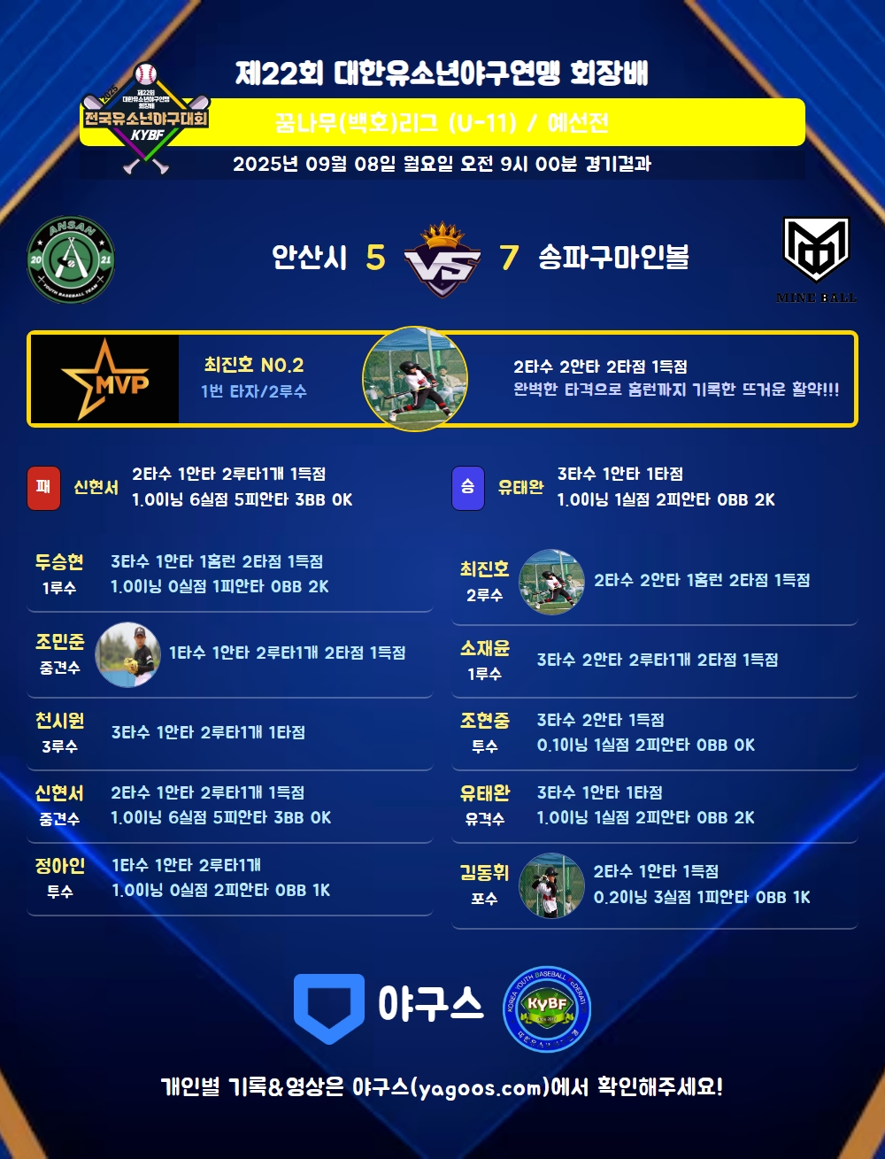 | 2루타 | 신현서(6) 천시원(17) 조민준(21) 정아인(25) 소재윤(8) |