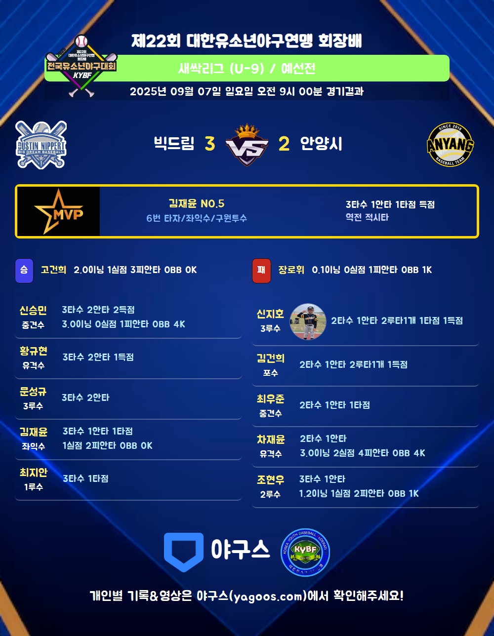 | 5 | 一 | 심기훈(6) | 삼진 | - | - | 유내안 | 좌플 | - | 3 | 1 | - | - | - | - | - | 1 | 0.333 |