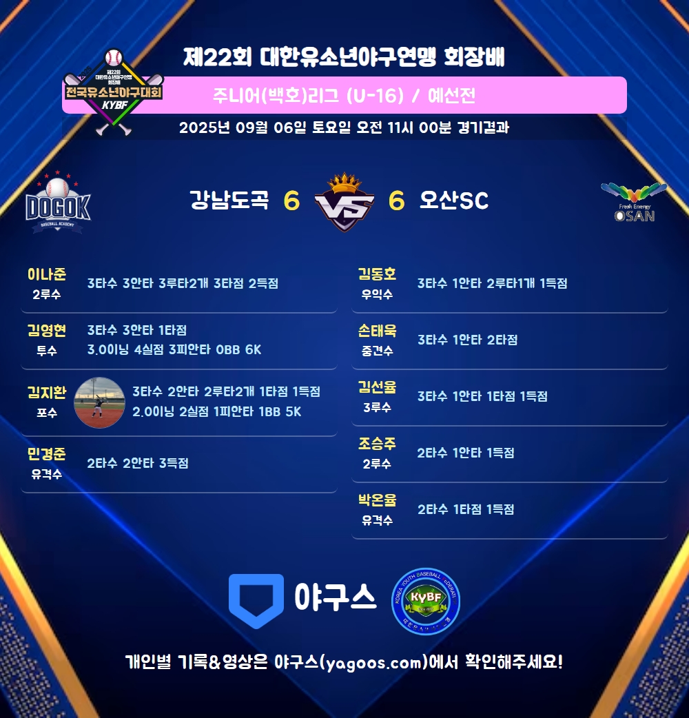 | 팀명 | 1회 | 2회 | 3회 | 4회 | 5회 | 6회 | R | H | E | B | L |