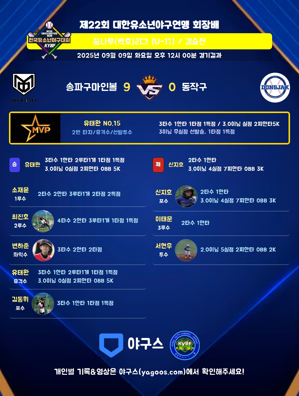 | 1 | 유태완(15) | 승 | 3.0 | 10 | 10 | 2 | - | - | 5 | 31 | - | - | 0 |