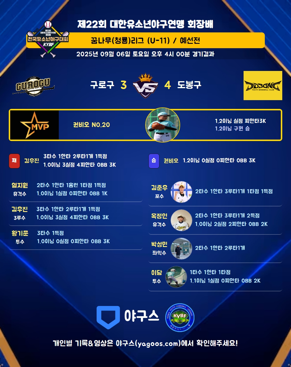 | 2 | 권비오(20) | 승 | 1.2 | 6 | 4 | - | - | 2 | 3 | 24 | - | - | 0 |
