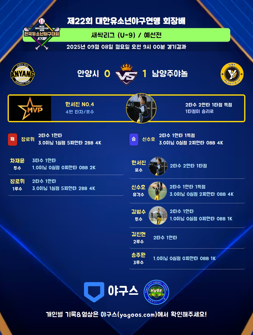 | 4 | 포 | 한서진(4) | 2내안(1타점) | - | 중안 | - | - | 2 | 2 | 1 | - | - | - | - | - | 1.000 |