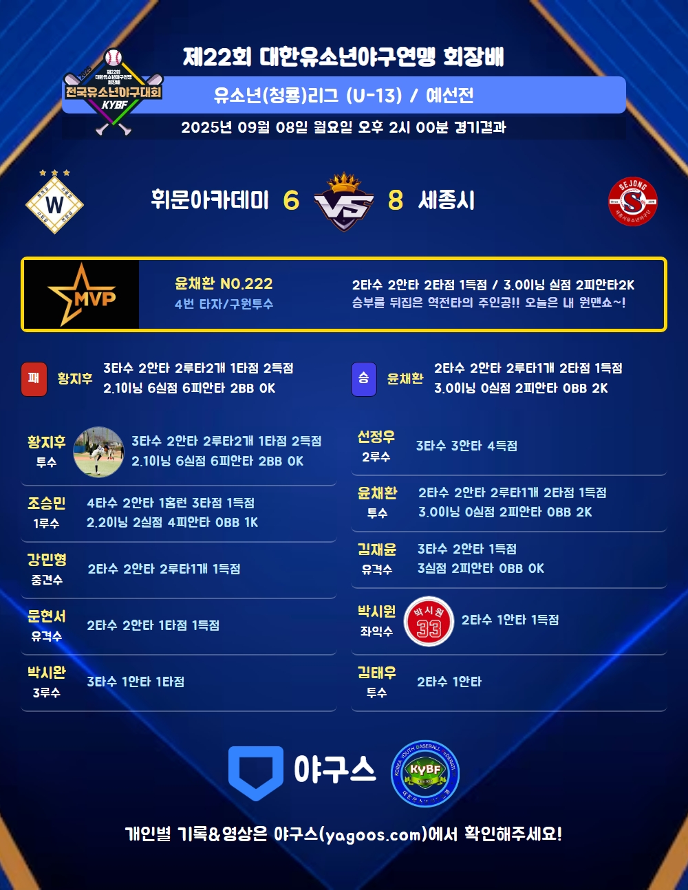 | 4 | 투 | 윤채환(222) | - | - | - | - | 중안 | 중월2(2타점) | 2 | 2 | 2 | 1 | - | 1 | - | - | 1.000 |
