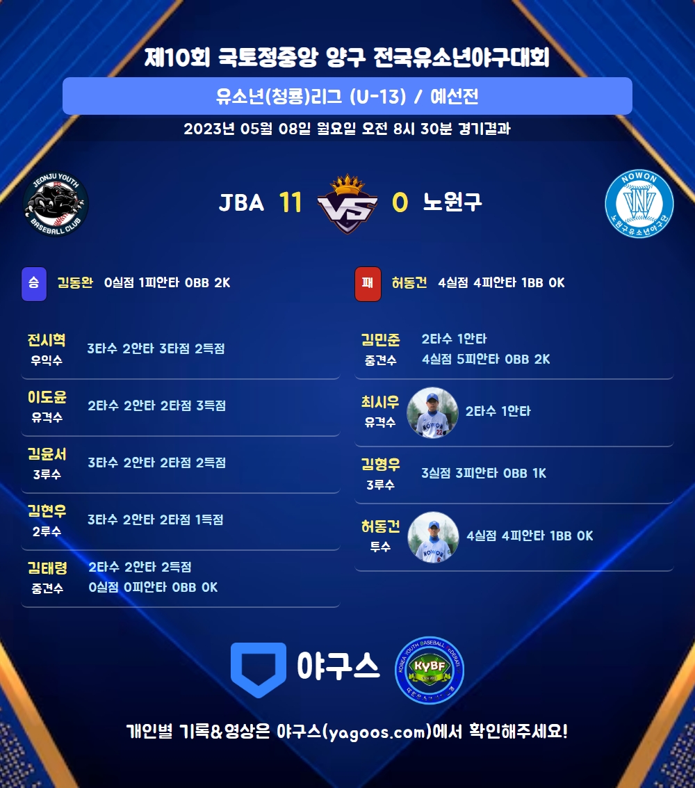 | 1 | 중 | 김민준(1) | 1플 | - | 우월3 | 2 | 1 | 0 | 0 | 0 | 0 | - | 0 | 0.500 |