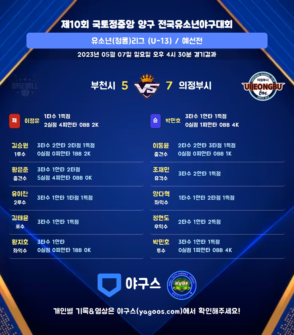 | 1 | 二 | 유이찬(58) | 유땅 | - | 유플 | - | - | 3 | 1 | 1 | 1 | 0 | 0 | - | 0 | 0.333 |