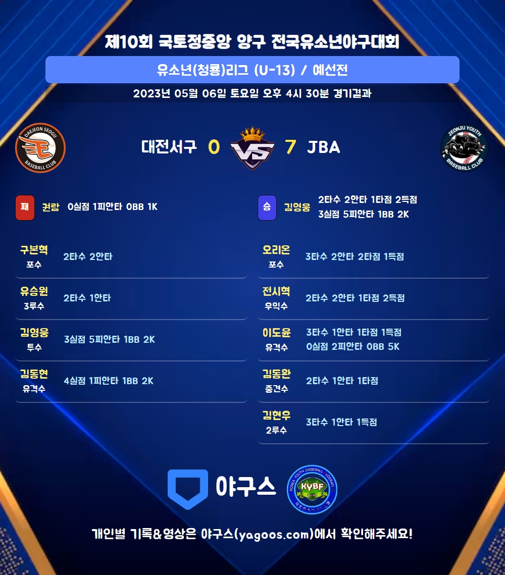 | 1 | 유 | 이도윤(5) | 3직 | 유땅 | - | - | 좌월홈 | 3 | 1 | 1 | 1 | 0 | 0 | - | 0 | 0.333 |