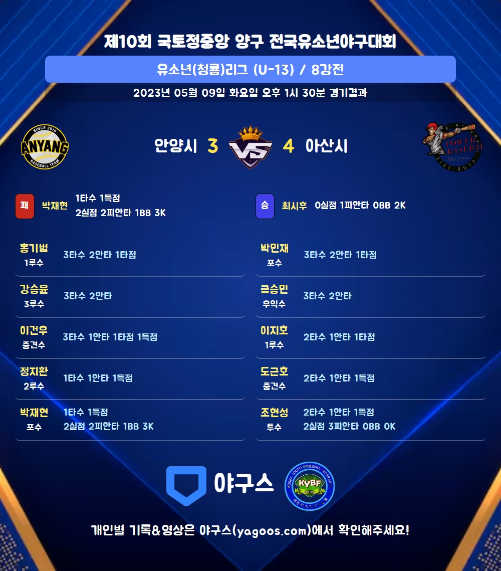 | 9 | 포 | 박민재(42) | - | - | 삼진 | - | 우중안 | 3 | 2 | 1 | 0 | 0 | 0 | - | 1 | 0.667 |