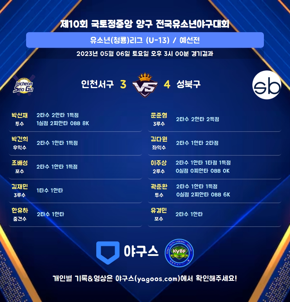 | 6 | 포 | 조배성(13) | - | 유땅 | - | - | 2 | 1 | 0 | 1 | 0 | 1 | - | 0 | 0.500 |