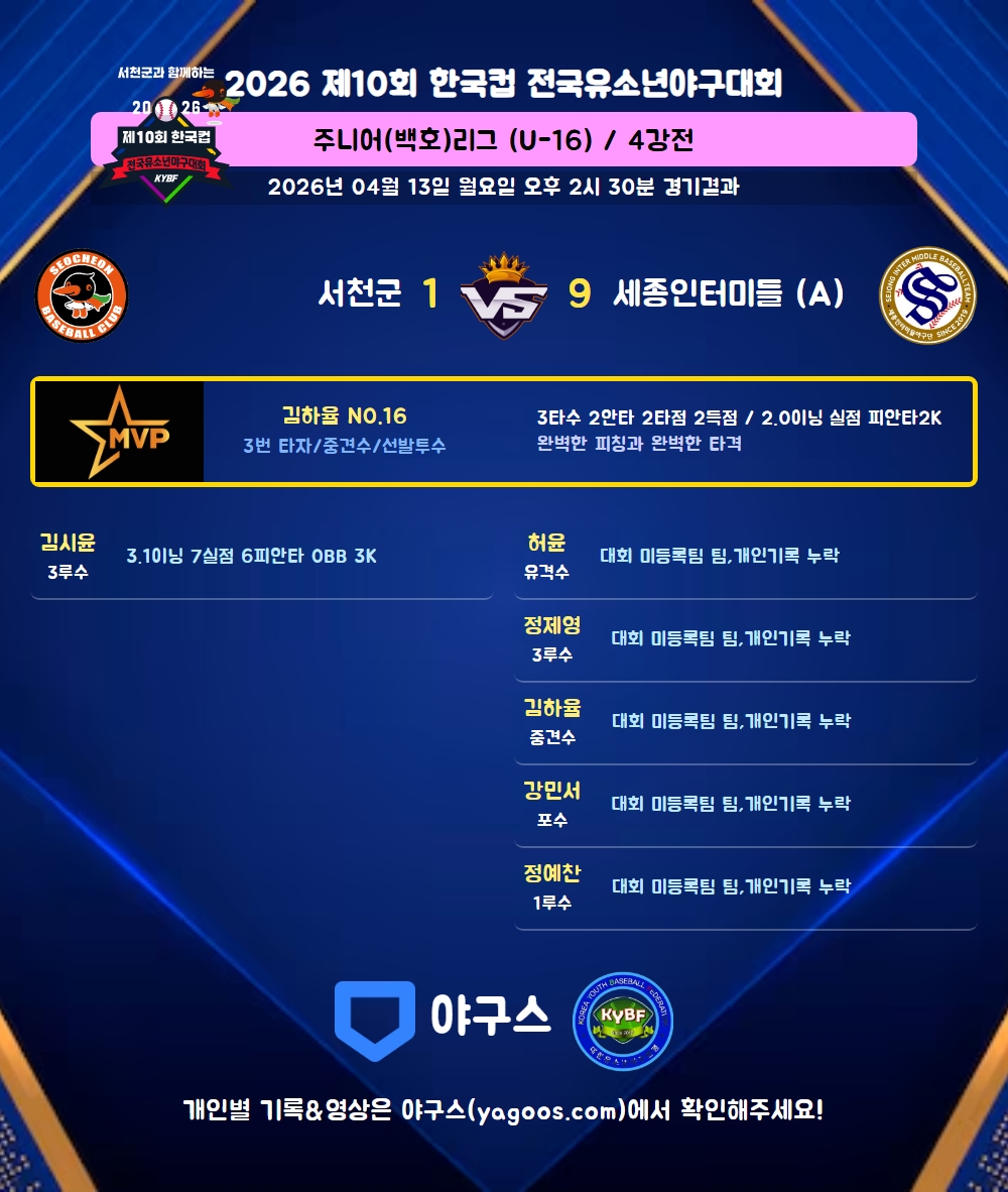 | 4 | 포 | 강민서(13) | 대회 미등록팀 팀 / 개인기록 누락 | |||||||||||||||||||