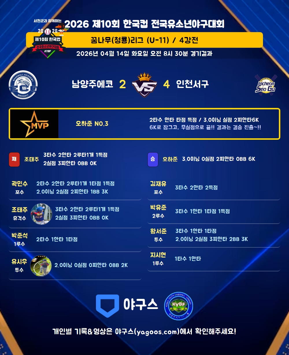 | 2 | 二 | 박유준(14) | 좌안(1타점) | 삼진 | - | 3실 | - | 3 | 1 | 1 | 1 | - | 2 | - | 1 | 0.333 |