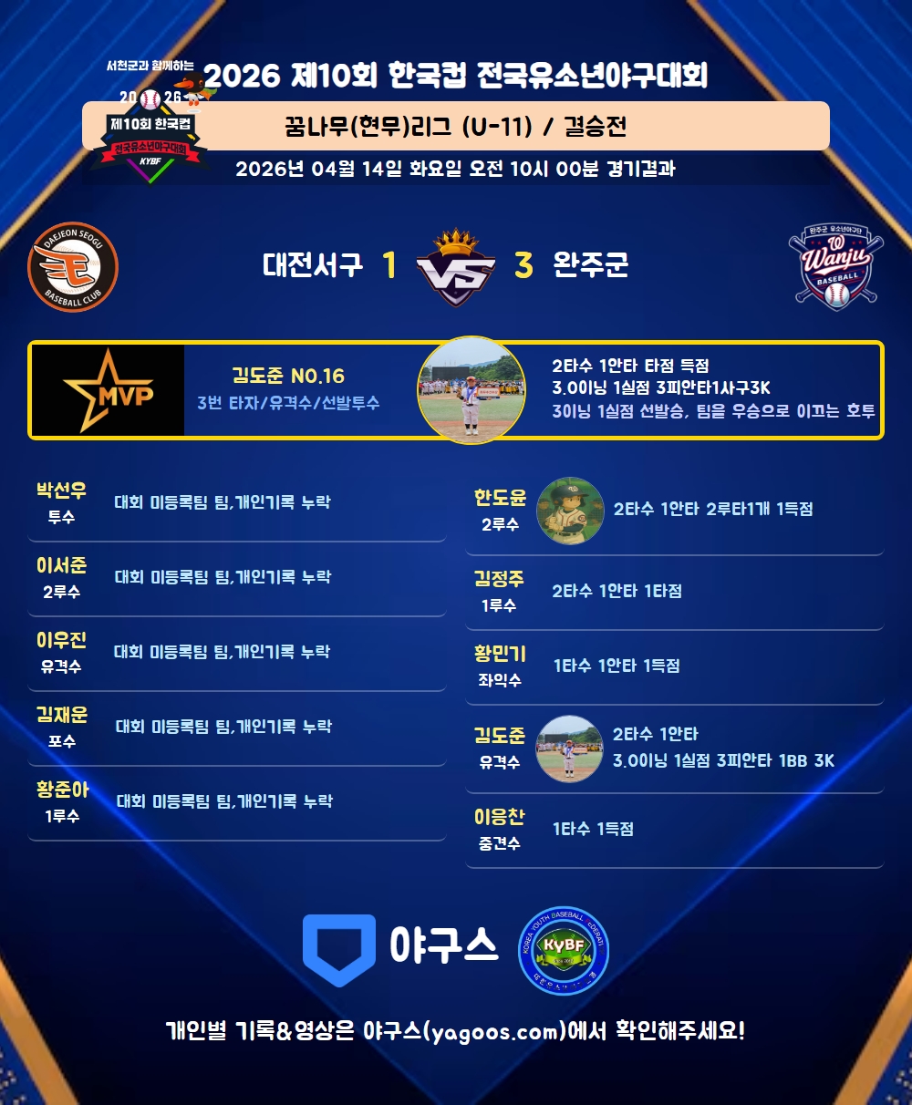 | 3 | 유 | 김도준(16) | 중안 | - | 삼진 | - | - | 2 | 1 | - | - | - | - | - | 1 | 0.500 |
