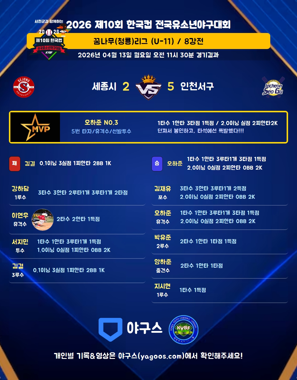 | 5 | 유 | 오하준(3) | 우월3(3타점) | - | 사구 | - | - | 1 | 1 | 3 | 1 | - | 1 | 1 | - | 1.000 |