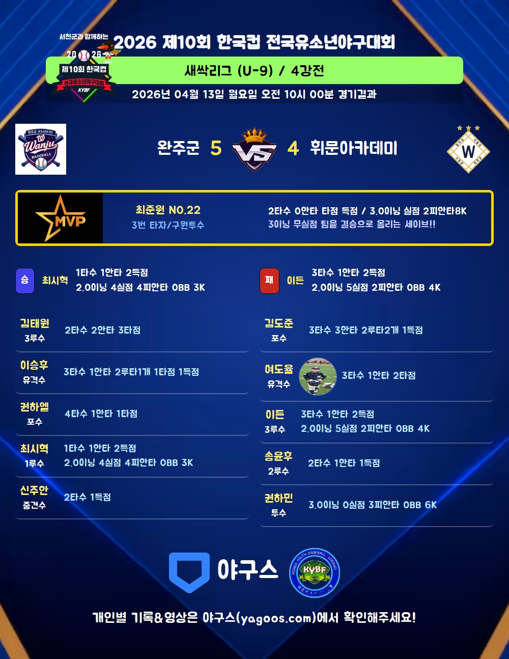 | 9 | 우 | 최도윤(15) | - | 4구 | 삼진 | - | 2땅 | - | 2 | 0 | - | 1 | - | - | 1 | 1 | 0.000 |