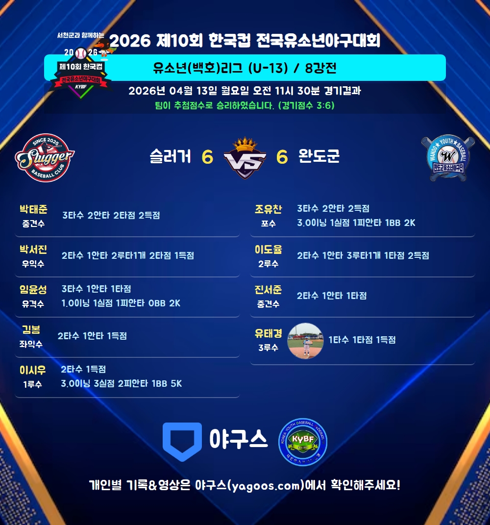 | 6 | 二 | 안유찬(18) | - | 2땅 | - | 투땅출 | 4구 | - | 2 | 0 | - | 1 | - | - | 1 | - | 0.000 |