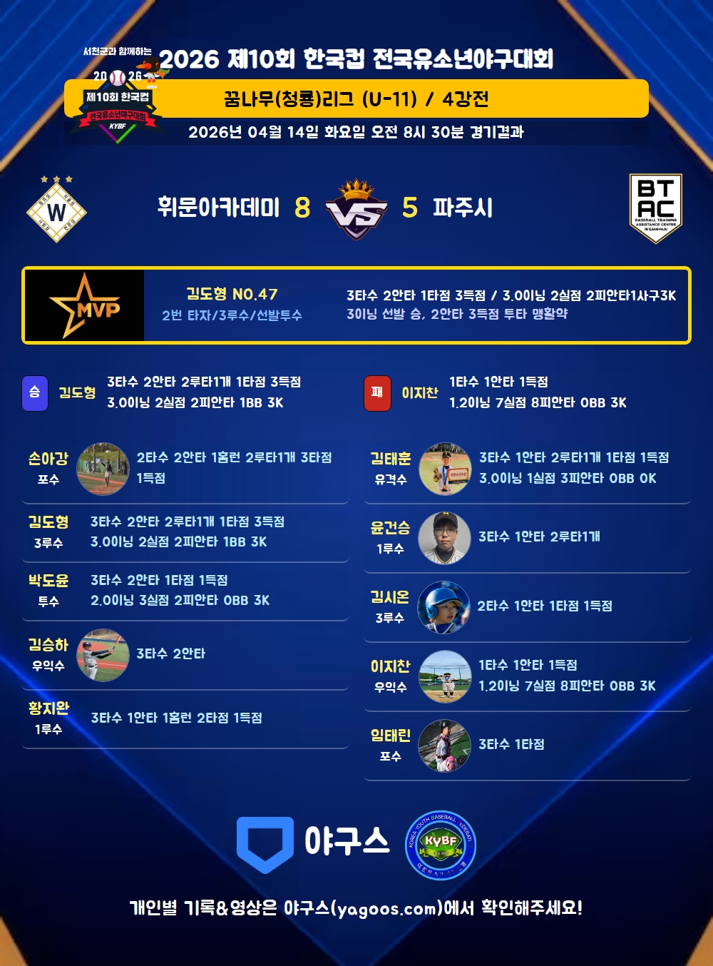 | 3 | 투 | 박도윤(11) | 중플 | 중안(1타점) | - | 중안 | - | - | 3 | 2 | 1 | 1 | - | 1 | - | - | 0.667 |