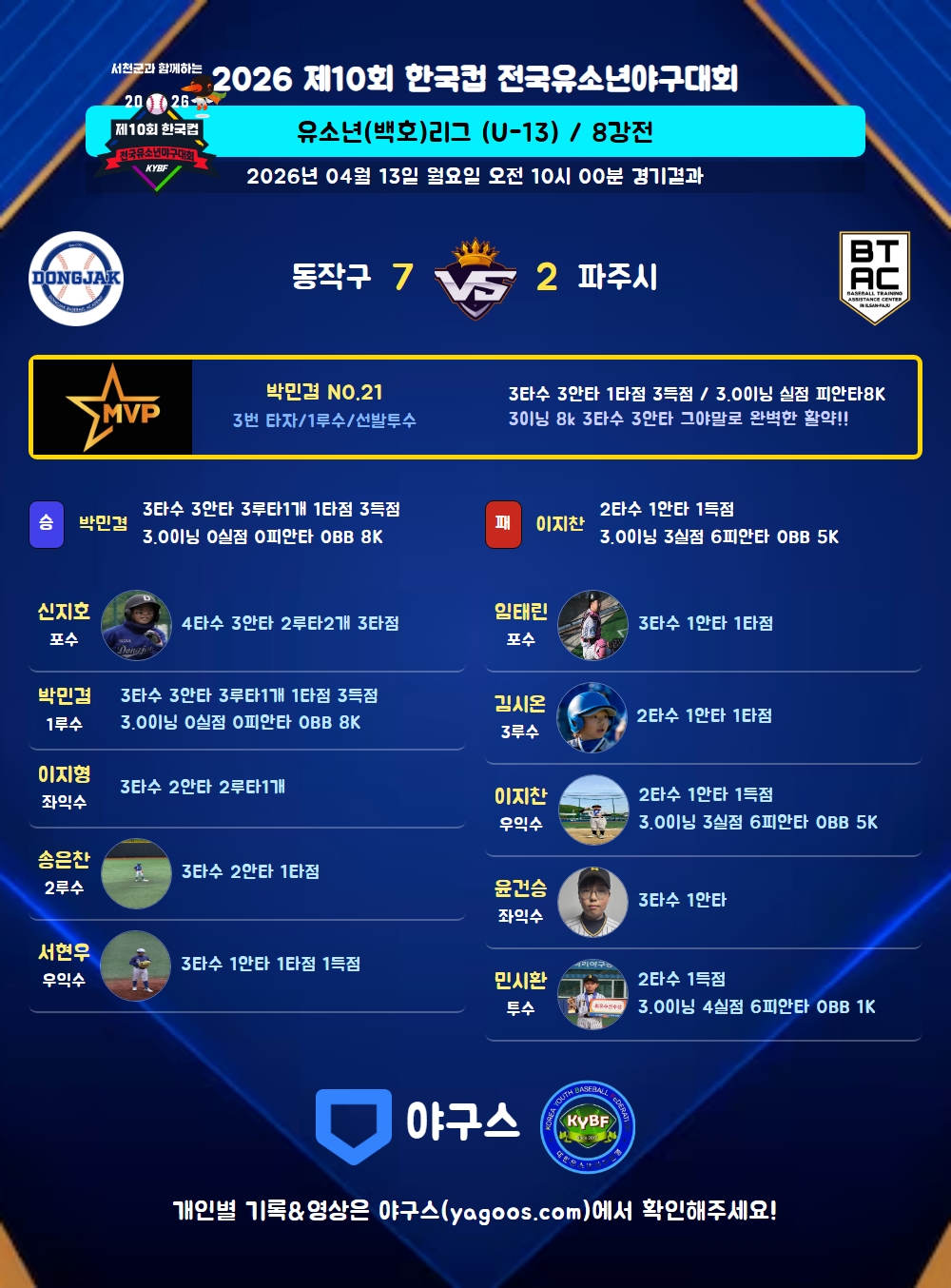 | 2 | 우 | 서현우(13) | 4구 | 중안 | - | 2땅(1타점) | - | 유플 | - | 3 | 1 | 1 | 1 | - | 1 | 1 | - | 0.333 |