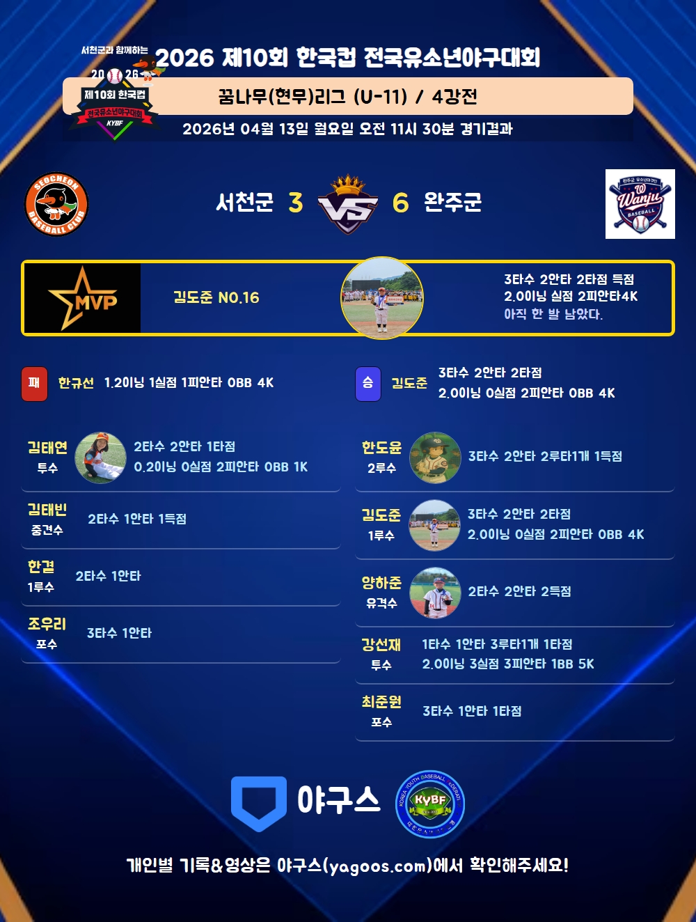 | 3 | 一 | 김도준(16) | 삼진 | - | 유내안(1타점) | 우중안(1타점) | 3 | 2 | 2 | - | - | - | - | 1 | 0.667 |