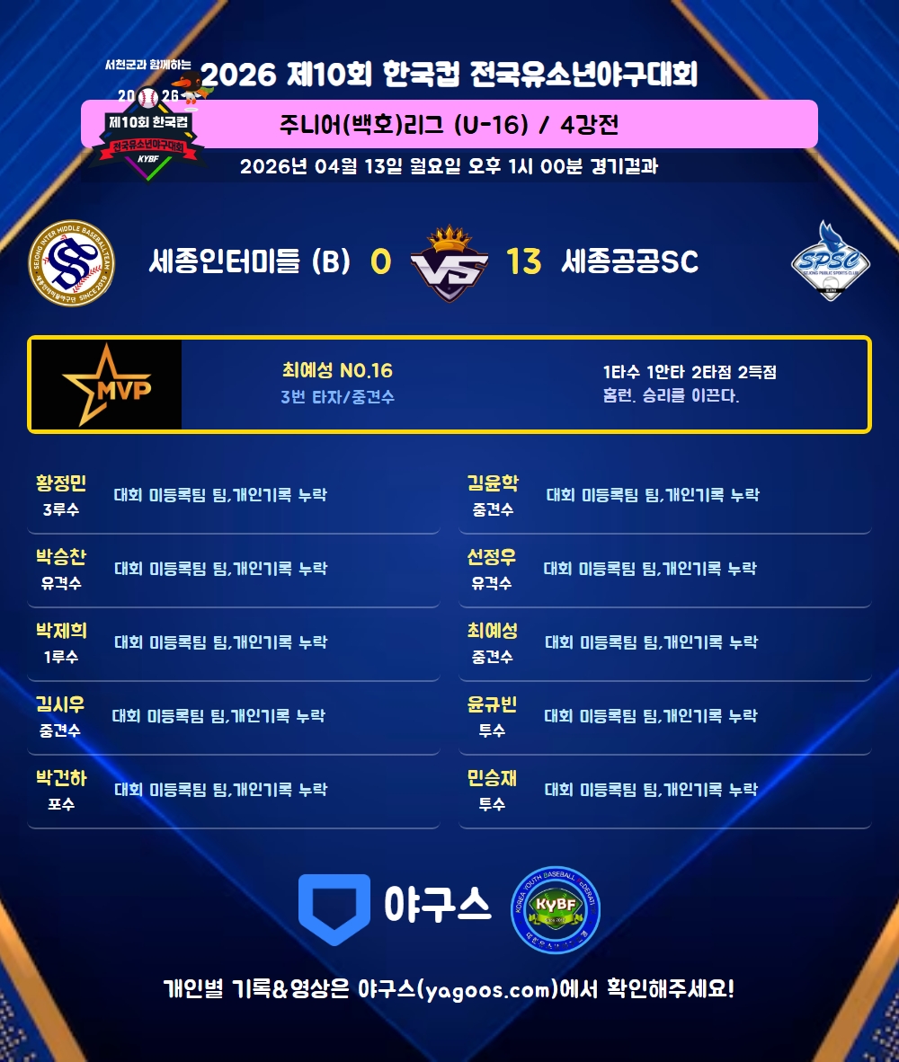 | 3 | 중 | 최예성(16) | 대회 미등록팀 팀 / 개인기록 누락 | |||||||||||||||||||