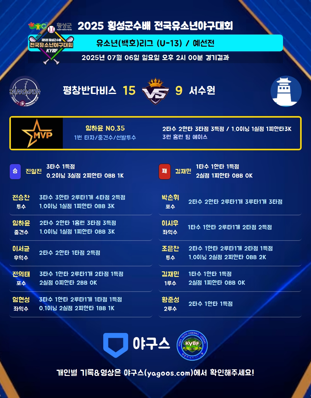 | 2루타 | 전의태(37) 전승찬(13) 엄현성(7) 조은찬(47) 박손휘(99) 이시우(50) |