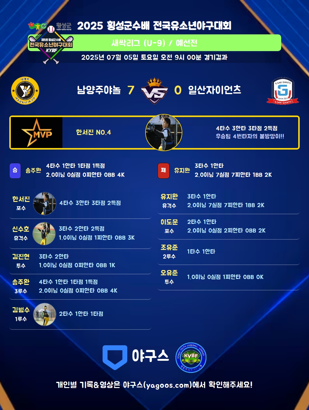 | 일산자이언츠 | 0 | 0 | 0 | 0 | 0 | 0 | 3 | 0 | 3 | 4 |