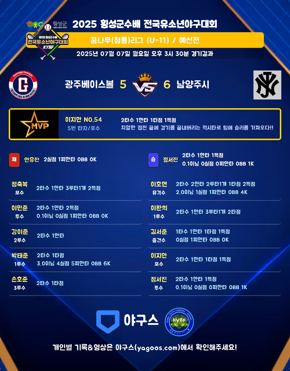| 광주베이스볼 | 3 | 0 | 1 | 1 | 0 | 5 | 3 | 0 | 6 | 6 |