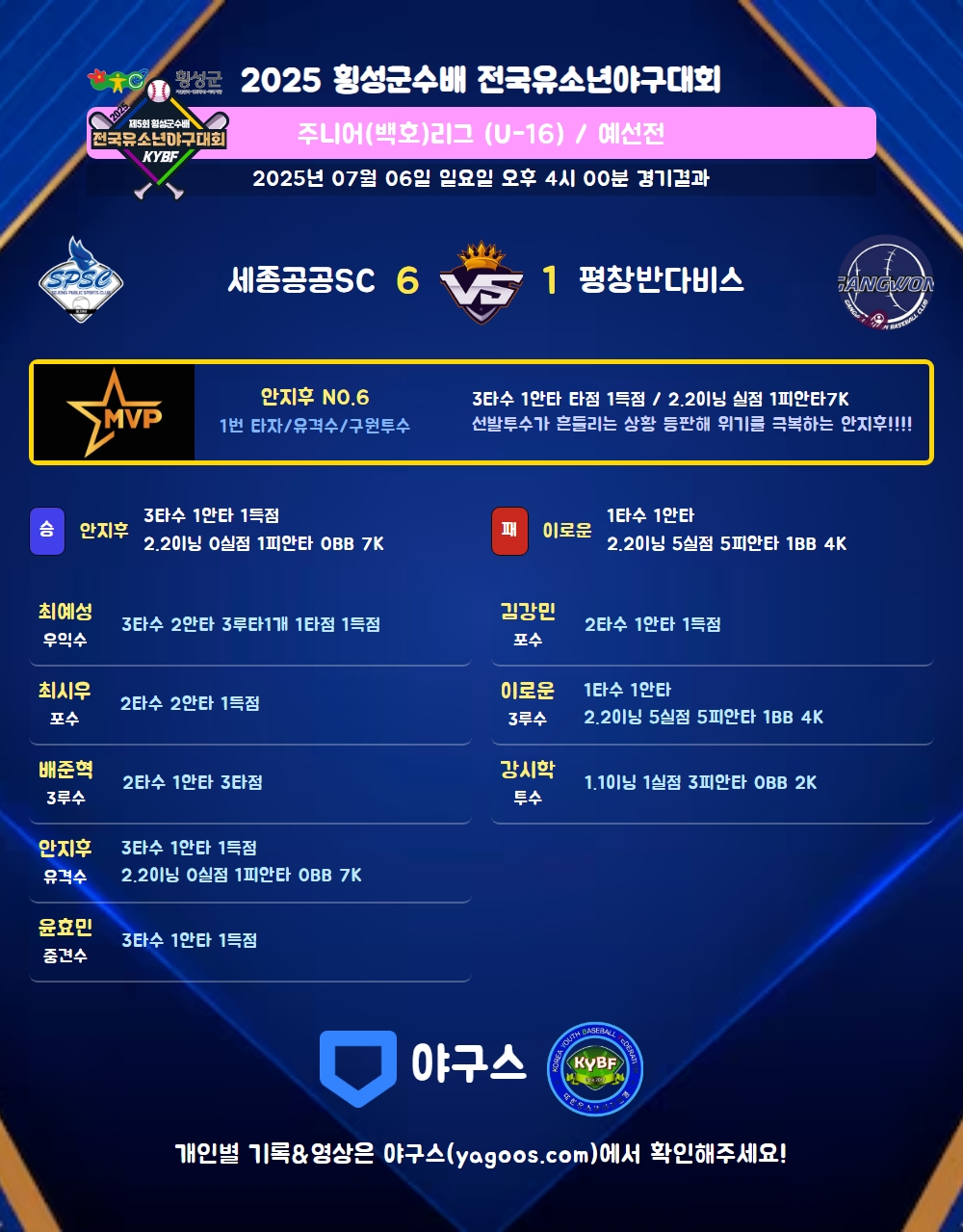 | 2 | 안지후(6) | 승 | 2.2 | 9 | 9 | 1 | - | - | 7 | 47 | - | - | 0 |