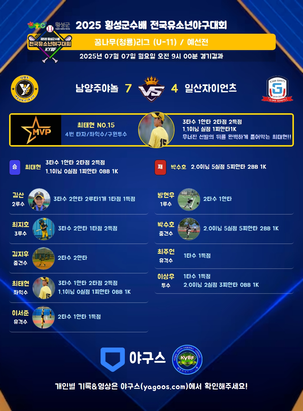 | 2 | 최태현(15) | 승 | 1.1 | 5 | 5 | 1 | - | - | 1 | 23 | - | - | 0 |