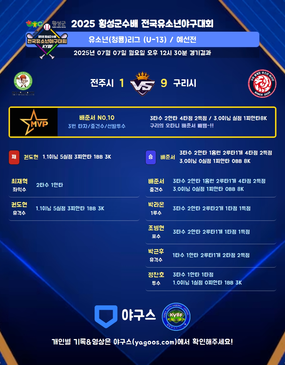 | 1 | 권도현(9) | 패 | 1.1 | 12 | 8 | 3 | 1 | 4 | 3 | 56 | 5 | 4 | 27.00 |