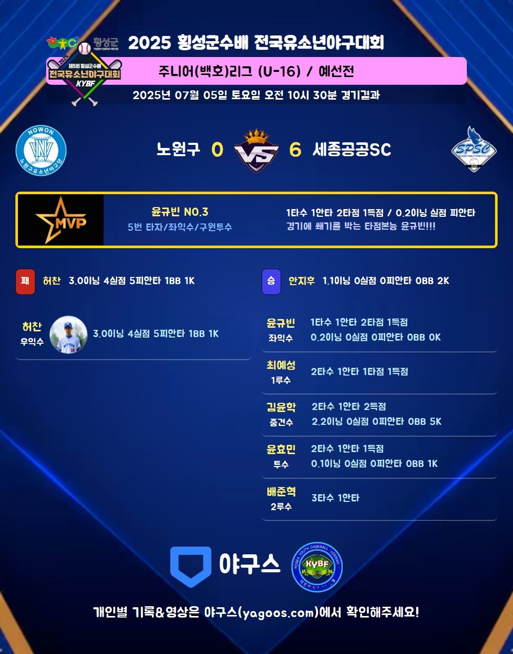 | 5 | 좌 | 윤규빈(3) | 중희플(1타점) | - | 중안 | 좌희플(1타점) | - | - | - | 1 | 1 | 2 | 1 | - | - | - | - | 1.000 |