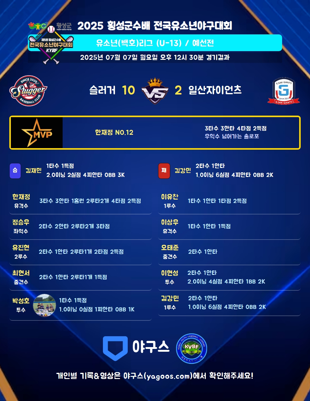 | 2 | 유 | 한재정(12) | 우월홈(1타점) | 좌중2(1타점) | 좌중2(2타점) | - | - | 3 | 3 | 4 | 2 | 1 | - | - | - | 1.000 |
