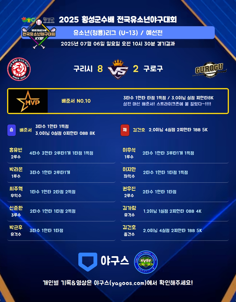 | 1 | 배준서(10) | 승 | 3.0 | 9 | 9 | - | - | - | 8 | 33 | - | - | 0 |