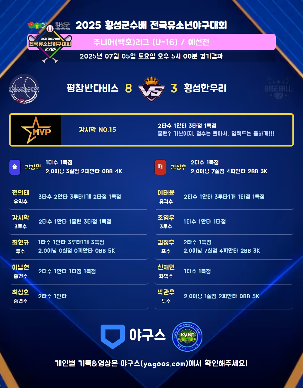 | 평창반다비스 | 5 | 2 | 0 | 1 | 0 | 0 | 0 | 8 | 6 | 0 | 3 | 1 |
