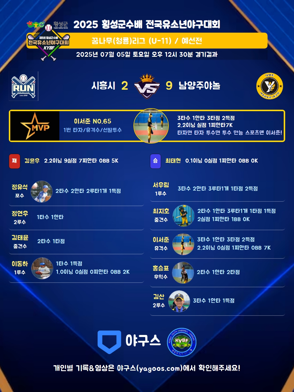 | 1 | 유 | 이서준(65) | 2실 | 중안(2타점) | 2땅출(1타점) | - | - | 3 | 1 | 3 | 2 | - | 2 | - | - | 0.333 |