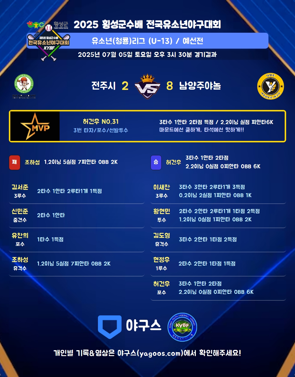| 3 | 포 | 허건우(31) | 2땅(1타점) | 중안(1타점) | - | 삼진 | - | - | 3 | 1 | 2 | - | - | - | - | 1 | 0.333 |