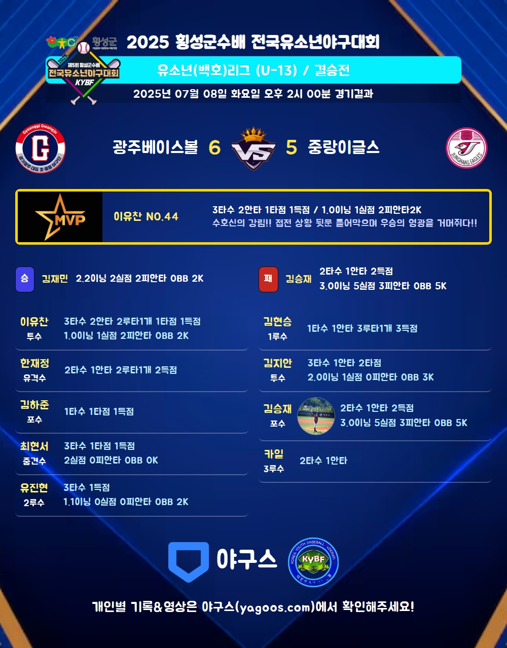 | 2 | 김재민(16) | 승 | 2.2 | 11 | 9 | 2 | - | 2 | 2 | 37 | 2 | 2 | 6.75 |
