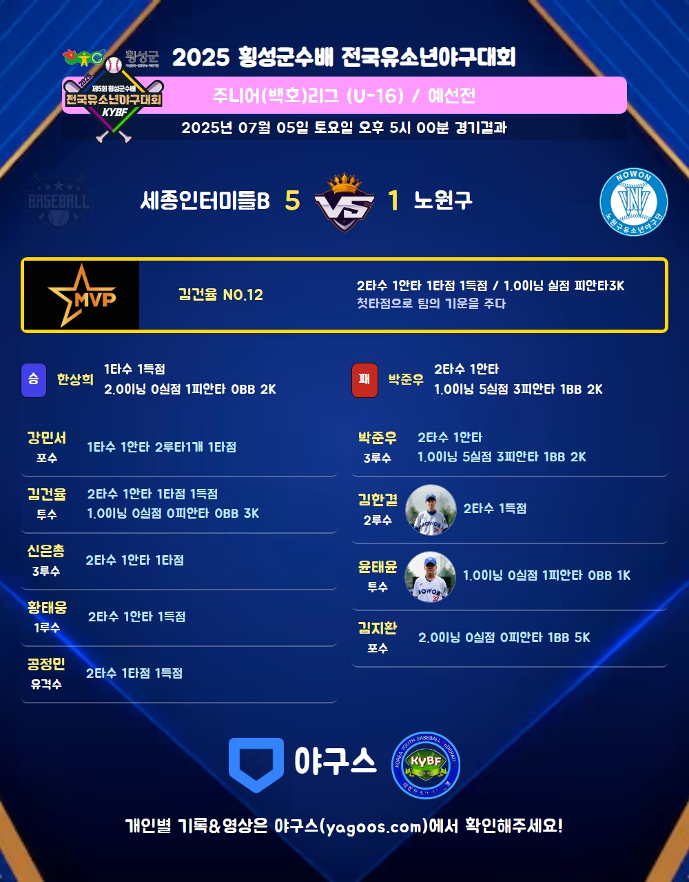 | 7 | 一 | 황태웅(300) | - | 중안/4구 | - | 삼진 | - | - | - | 2 | 1 | - | 1 | - | - | 1 | 1 | 0.500 |