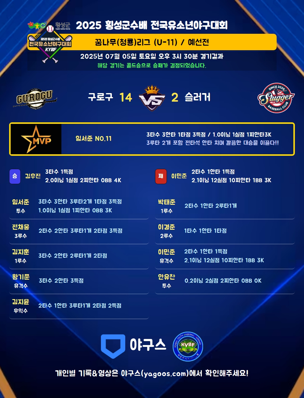 | 3루타 | 임서준(11) 전채웅(99) 김지윤(5) |