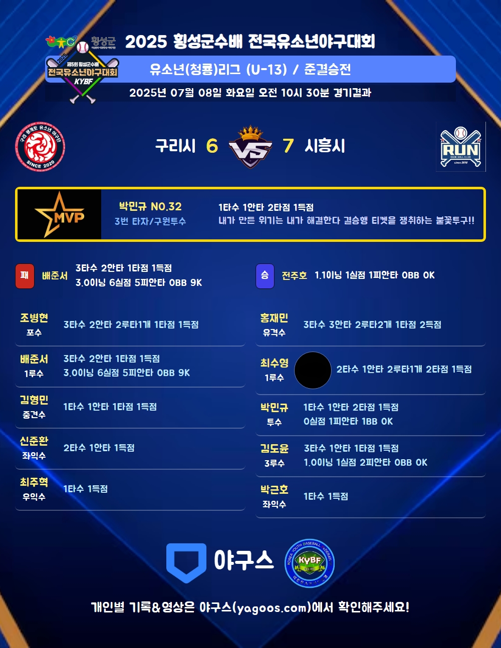 | 3 | 김도윤(13) | 홀드 | 1.0 | 4 | 4 | 2 | - | - | - | 20 | 1 | 1 | 9.00 |
