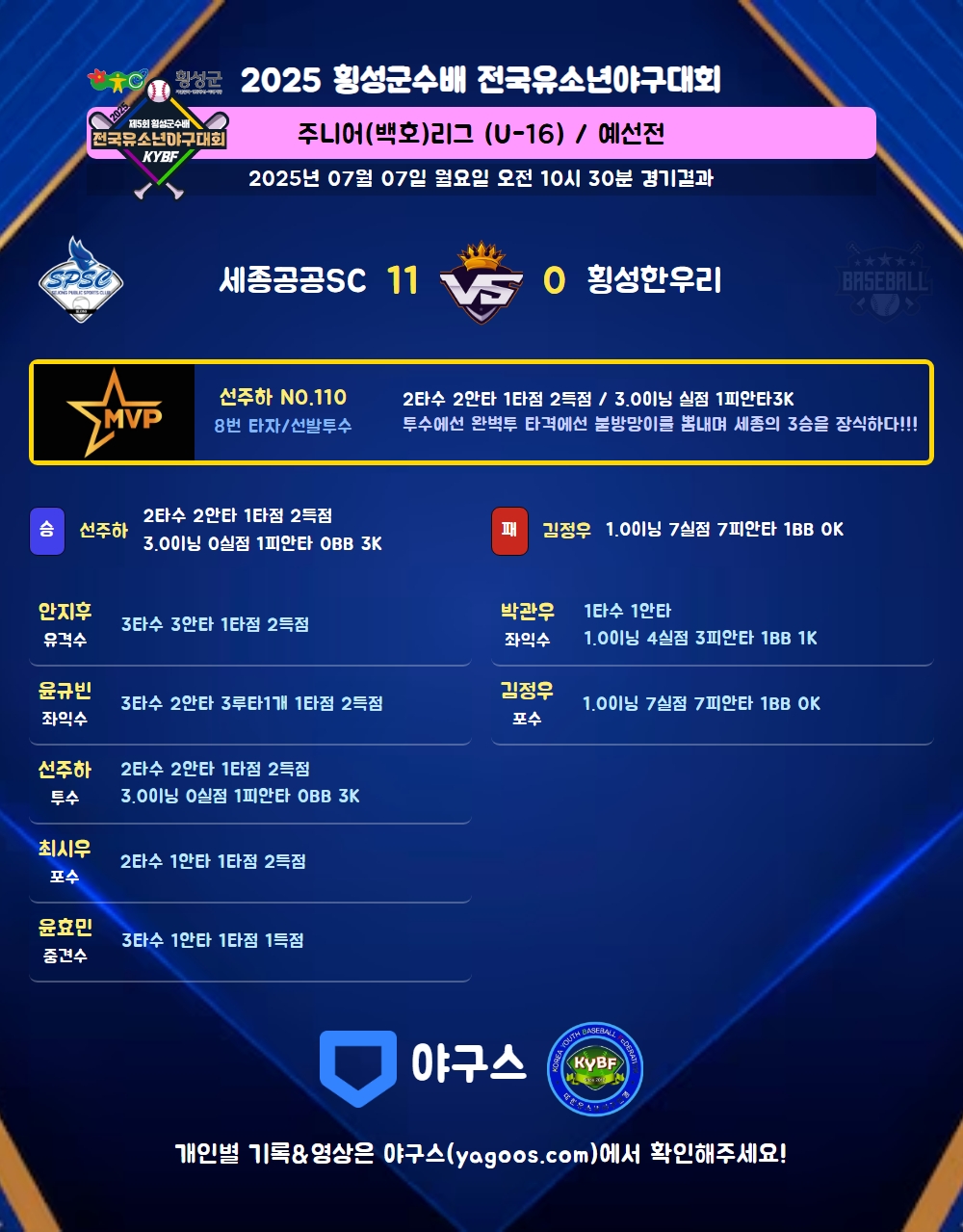 | 1 | 선주하(110) | 승 | 3.0 | 11 | 11 | 1 | - | - | 3 | 34 | - | - | 0 |